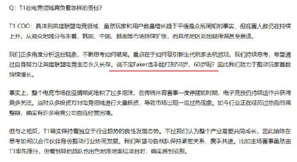 近日聚财略,T1俱乐部首席运营官(COO)在接受韩媒专访时谈到了《英雄联盟》电竞选手的职业寿命问题,半开玩笑地表示:“说不定Faker能打到50岁、60岁呢?”